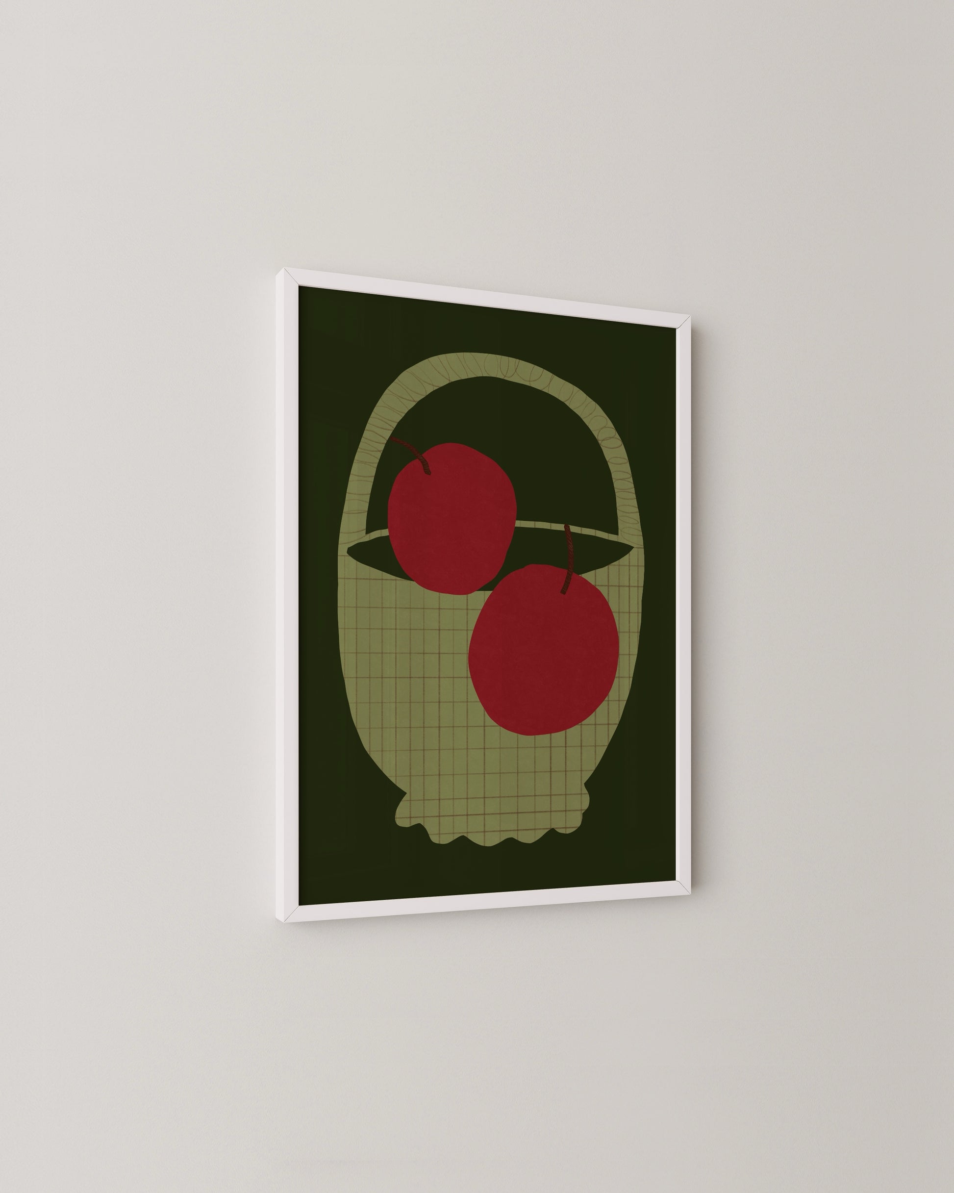 A bold fruit still life featuring two red apples in a patterned basket against a dark backdrop. Minimal yet eye-catching, this printable art is perfect for kitchens, dining rooms, or adding a pop of color to your gallery wall. Easy instant download for quick DIY decor.