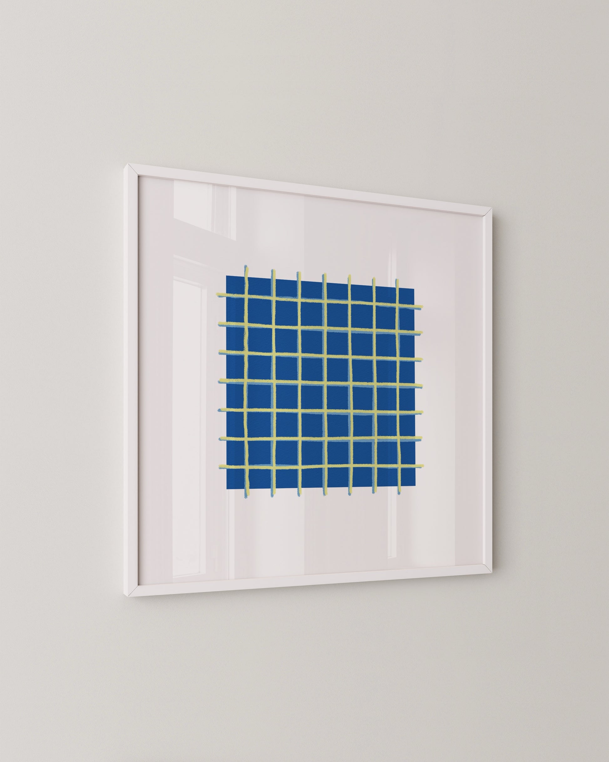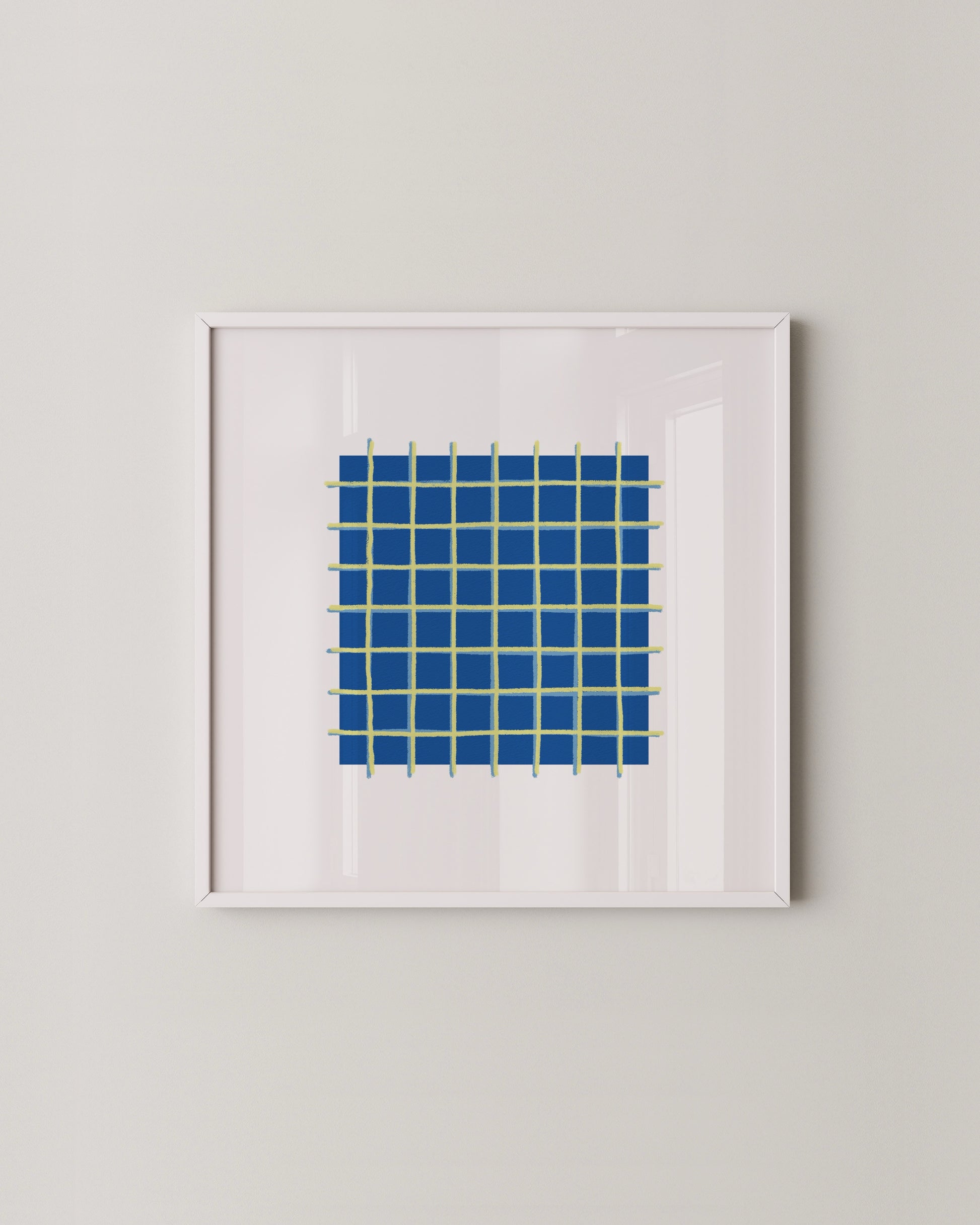 A simple abstract print featuring a bold cobalt blue square grid with soft green lines. Minimal yet eye-catching, this piece adds a touch of structure and modern charm to your space, perfect for mixing into a curated gallery wall or keeping it clean and standalone.