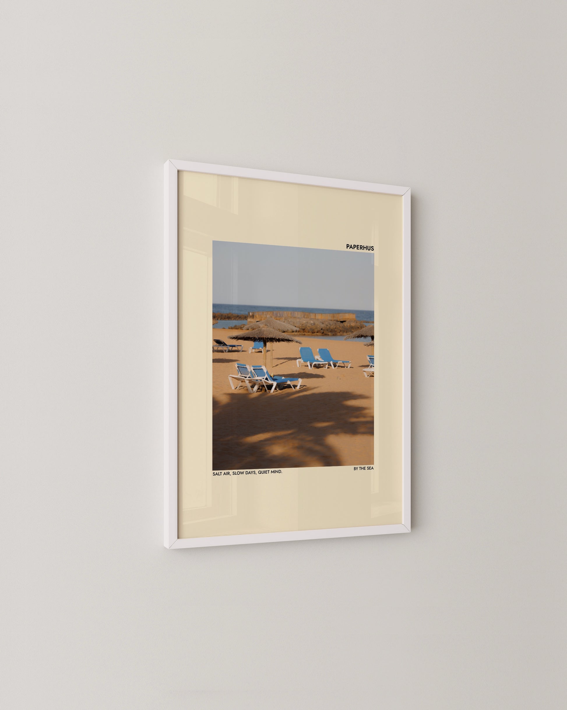 A calm coastal photograph featuring blue sun loungers and golden sand, captured in soft morning light. Minimal design with text reading “Salt air, slow days, quiet mind.” A printable photo print that brings a touch of Mediterranean ease to modern interiors.