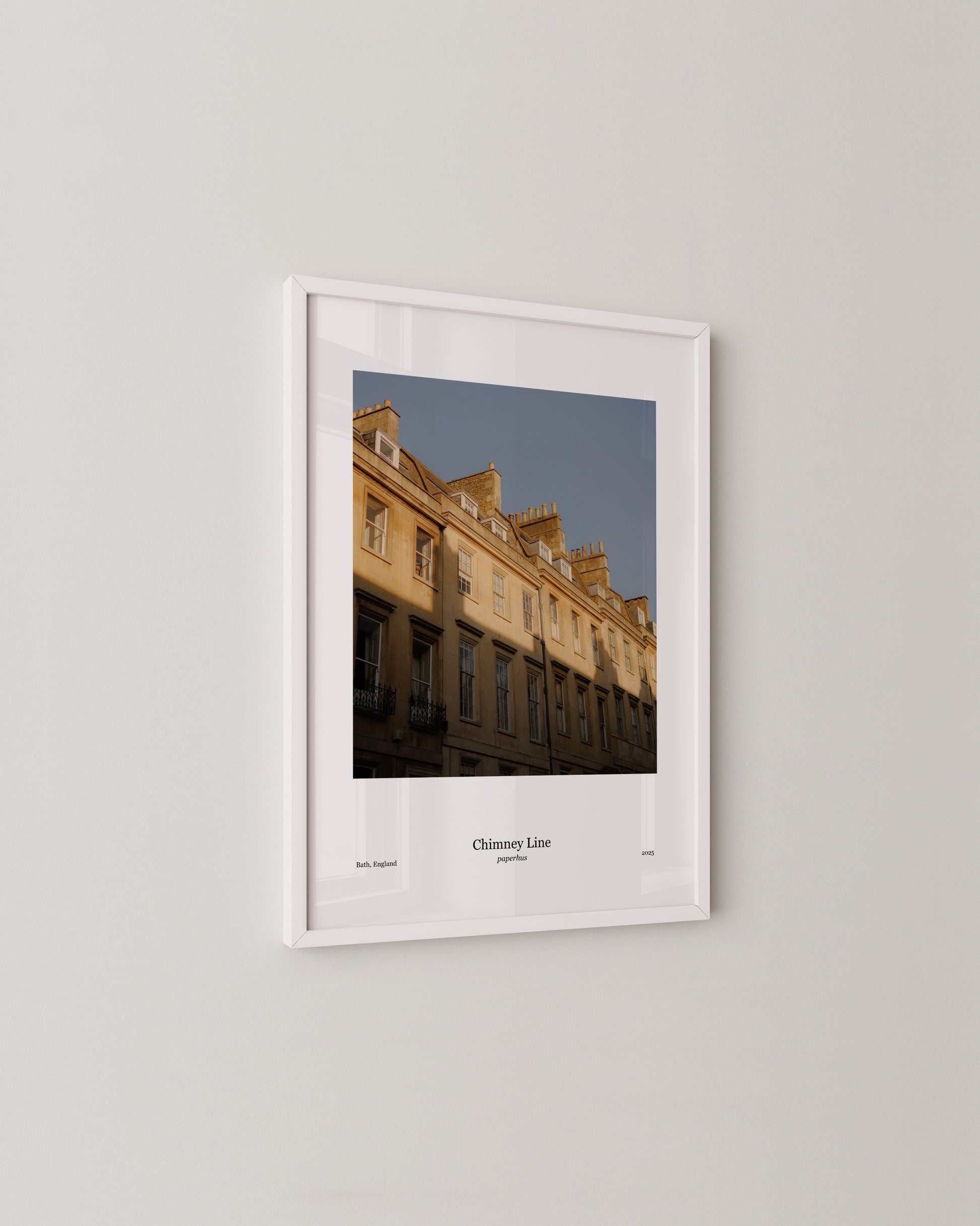 Late afternoon light catches the rooftops and chimneys of Bath’s Georgian terraces, a quiet nod to timeless British architecture. Soft shadows and warm tones make this print a calm, elegant addition to any interior.