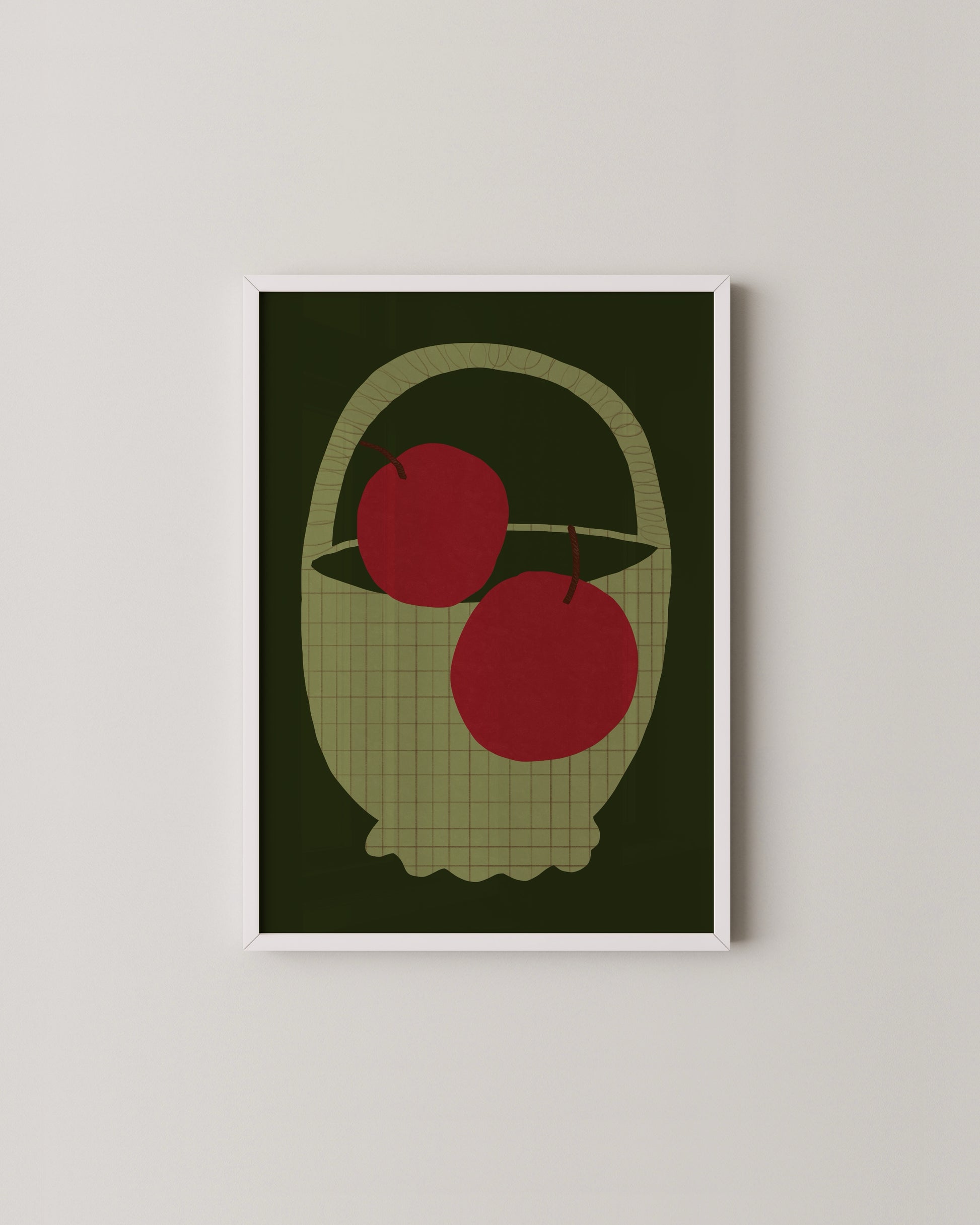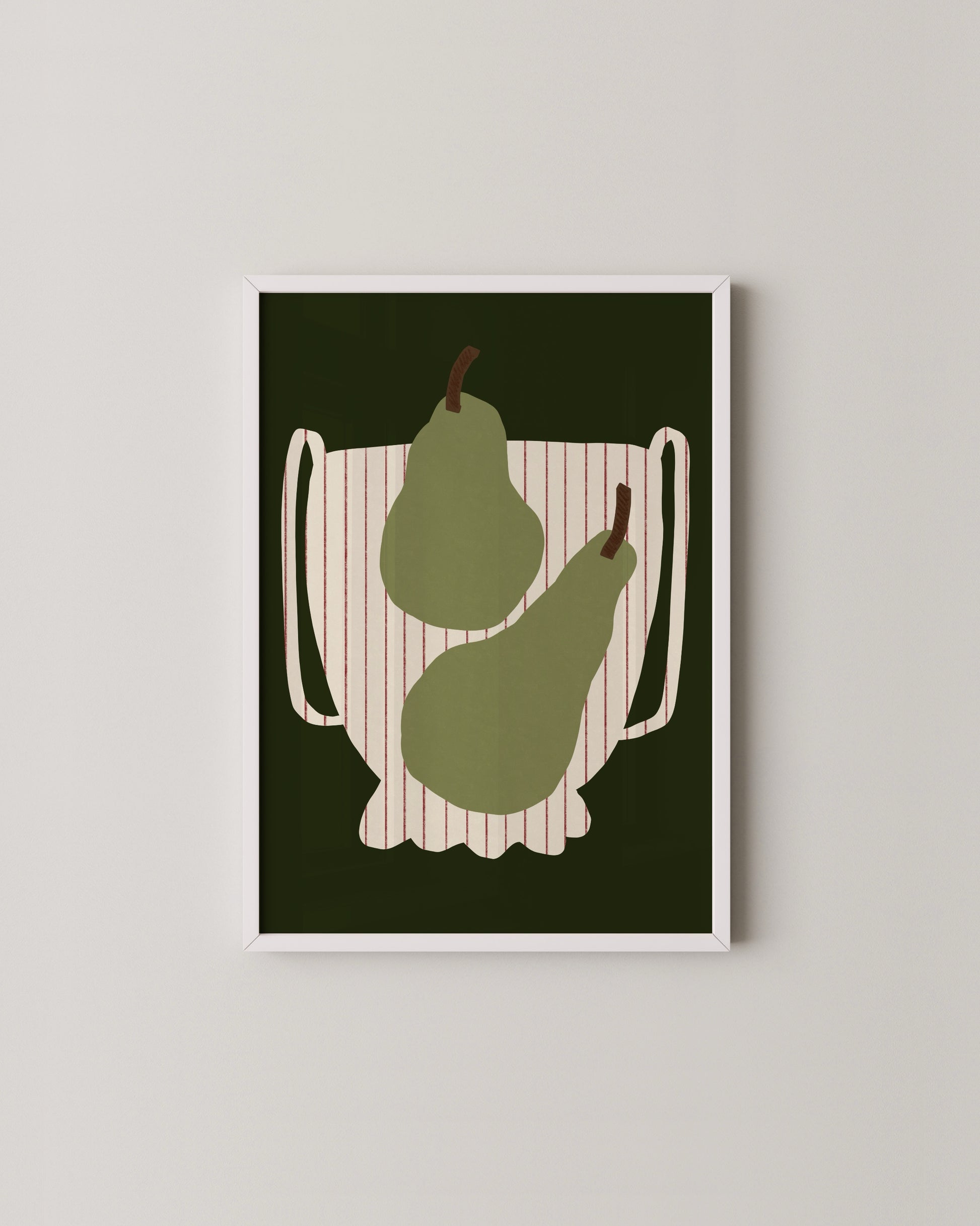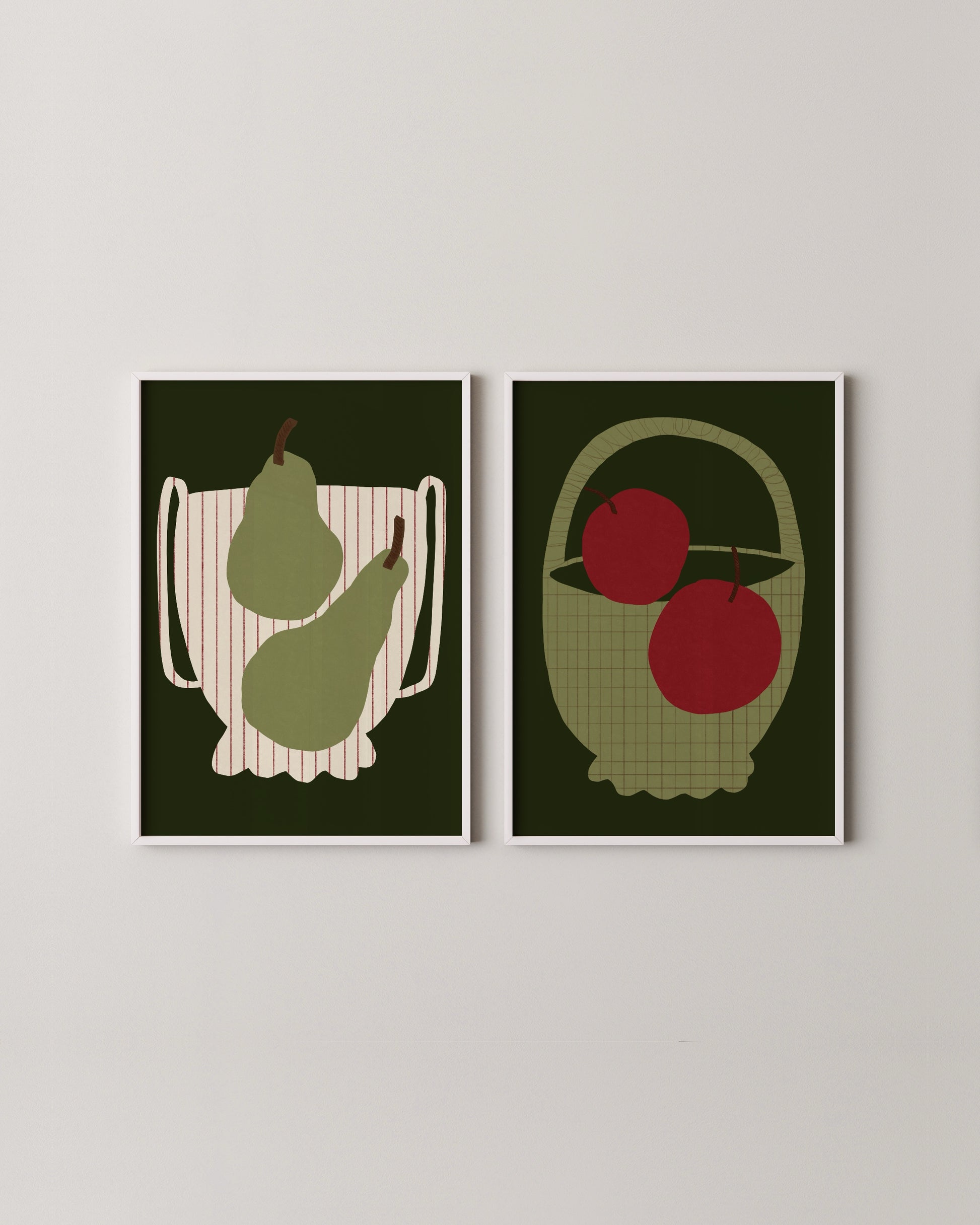 A playful set of two fruit still life prints featuring pears and apples in green and red tones. The earthy palette and graphic shapes add a touch of charm to kitchen or dining spaces. Perfect for modern homes with a love for simple, timeless art.