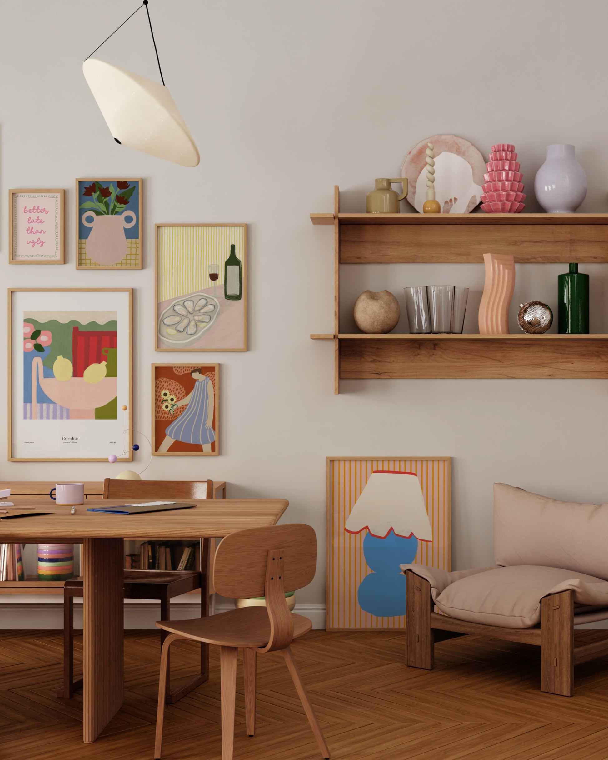 A vibrant and playful gallery wall featuring retro-inspired art prints in warm, colorful tones. Perfect for kitchen or dining spaces, this curated set blends whimsical still-life pieces, vintage-style lamps, and cheerful typography. A fun way to bring charm, color, and personality into your home decor.