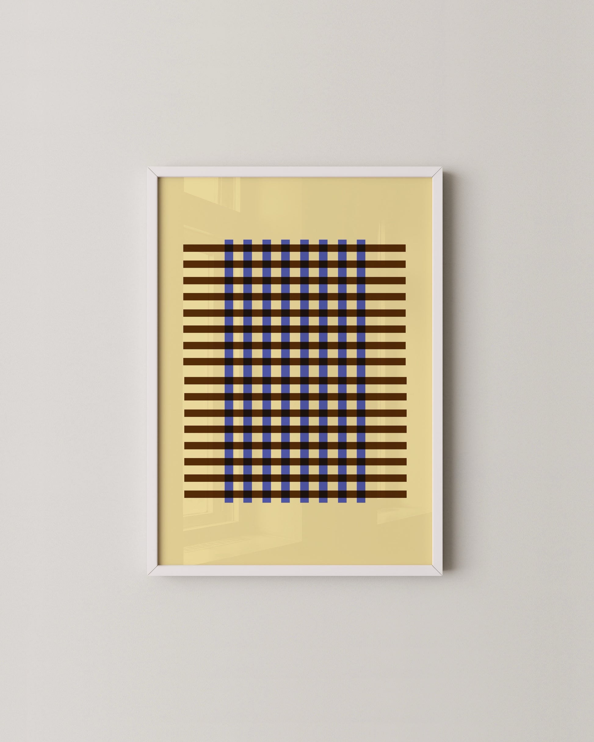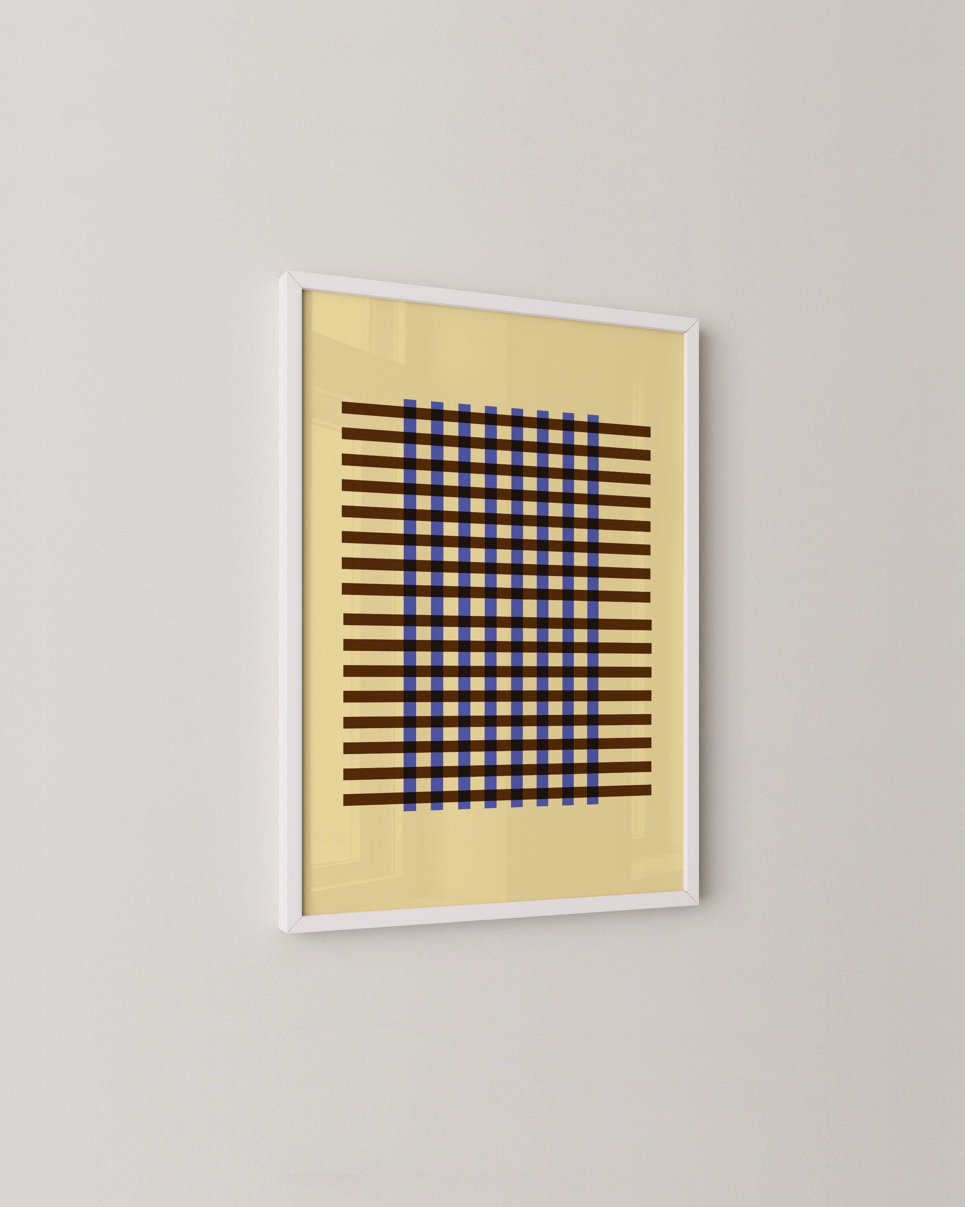 A bold grid art print featuring deep brown and blue stripes on a butter-yellow background. This modern geometric design adds structure and warmth to minimalist spaces, perfect for kitchens, studios, or statement gallery walls.