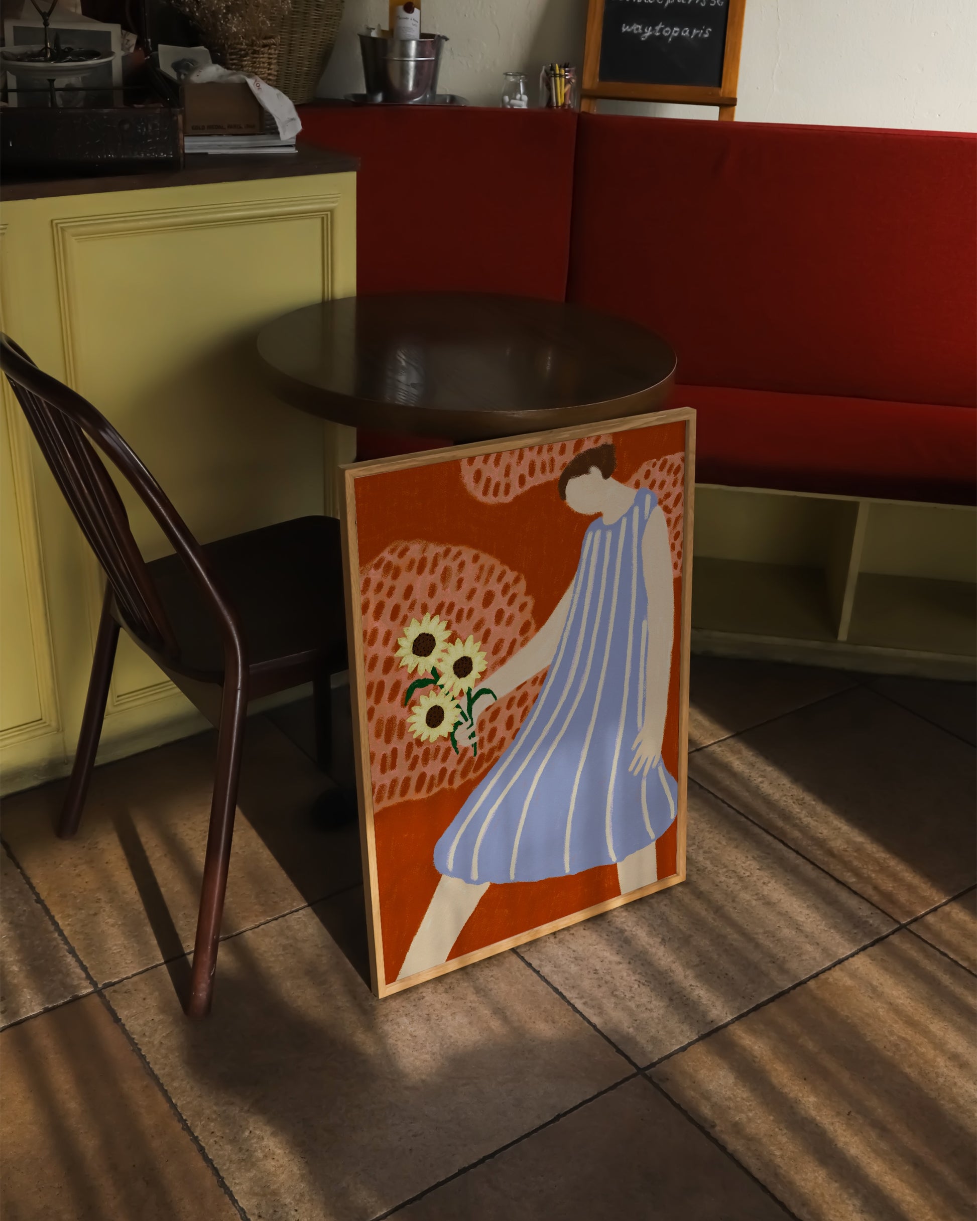 A modern figurative art print featuring a woman in a flowing blue dress holding sunflowers against a warm terracotta background. The mix of earthy and soft tones brings balance and charm to your walls, perfect for a living room, bedroom, or creative corner.