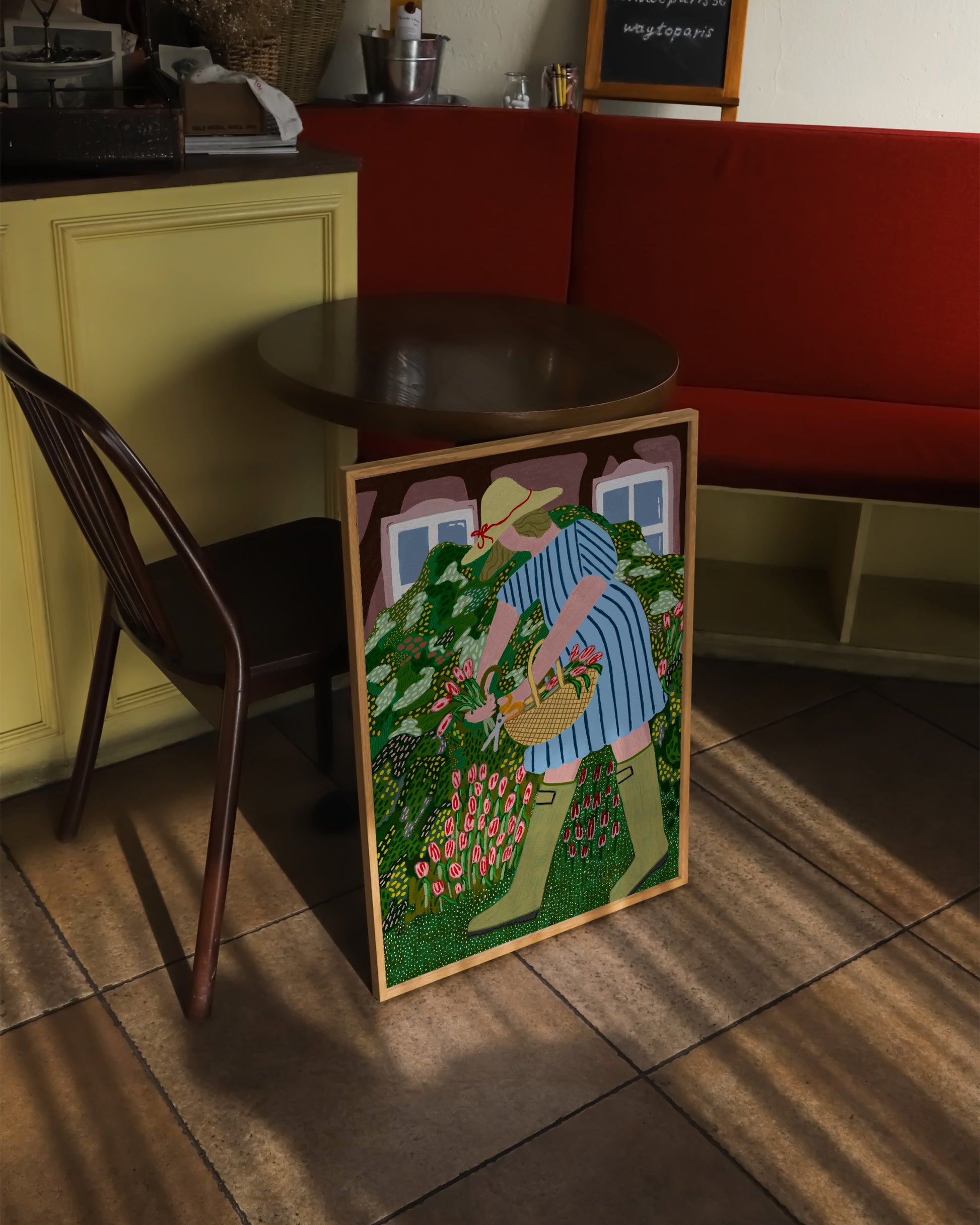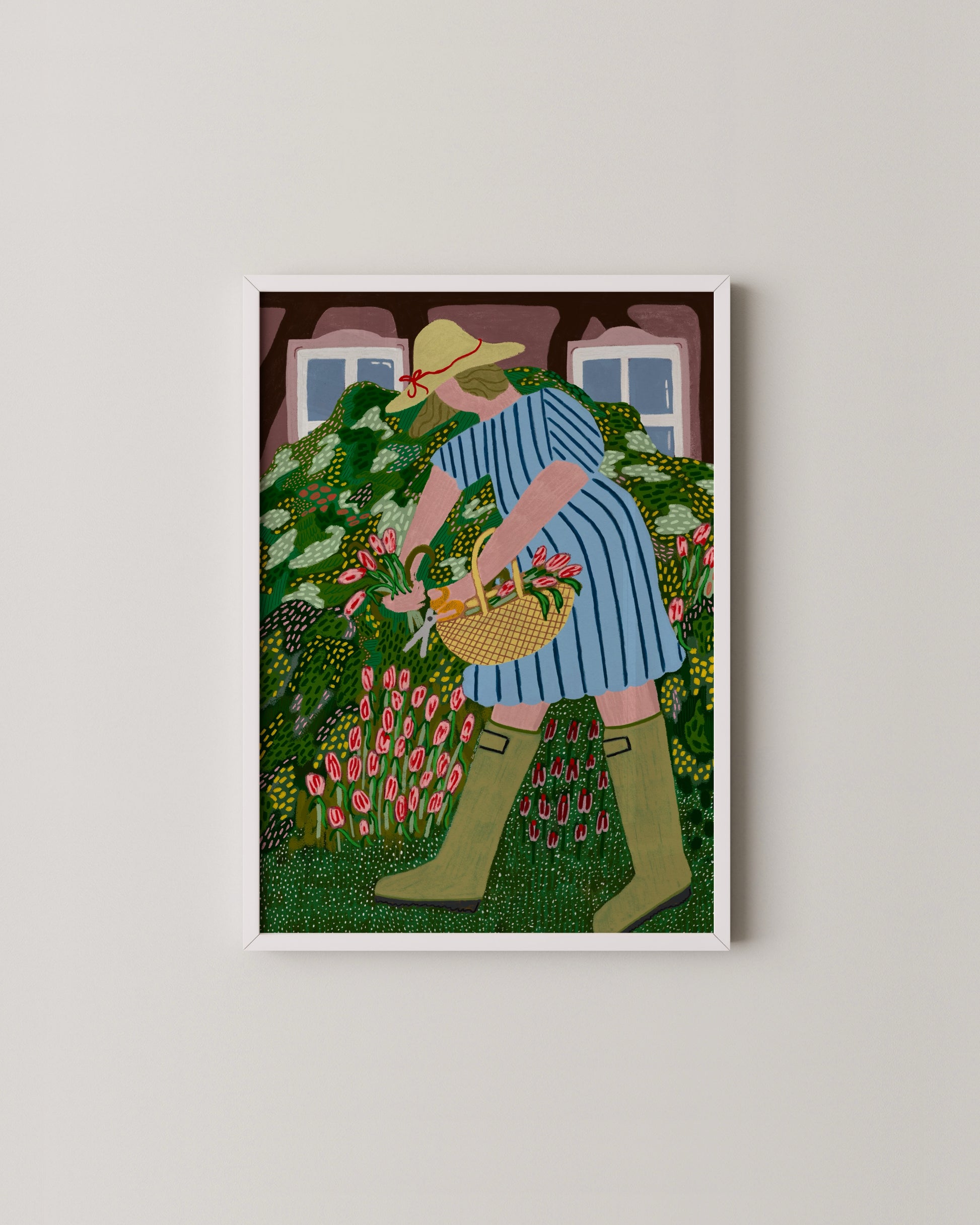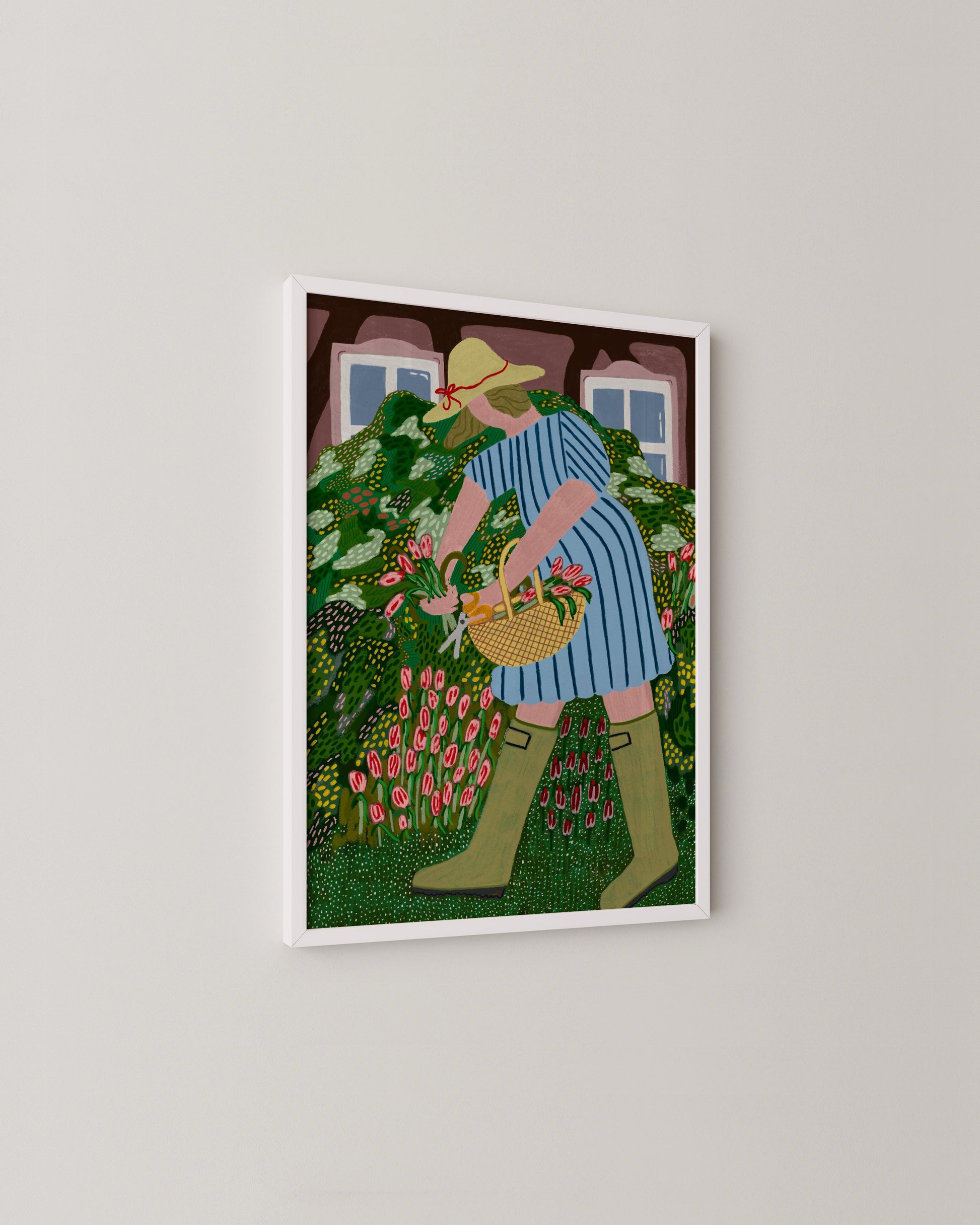 A playful figurative art print showing a woman in a blue striped dress gathering flowers in a lush green garden. Bold shapes, layered foliage, and soft textures give this piece a relaxed, storybook feel. A warm, cheerful print that works beautifully in kitchens, dining spaces, or creative corners.