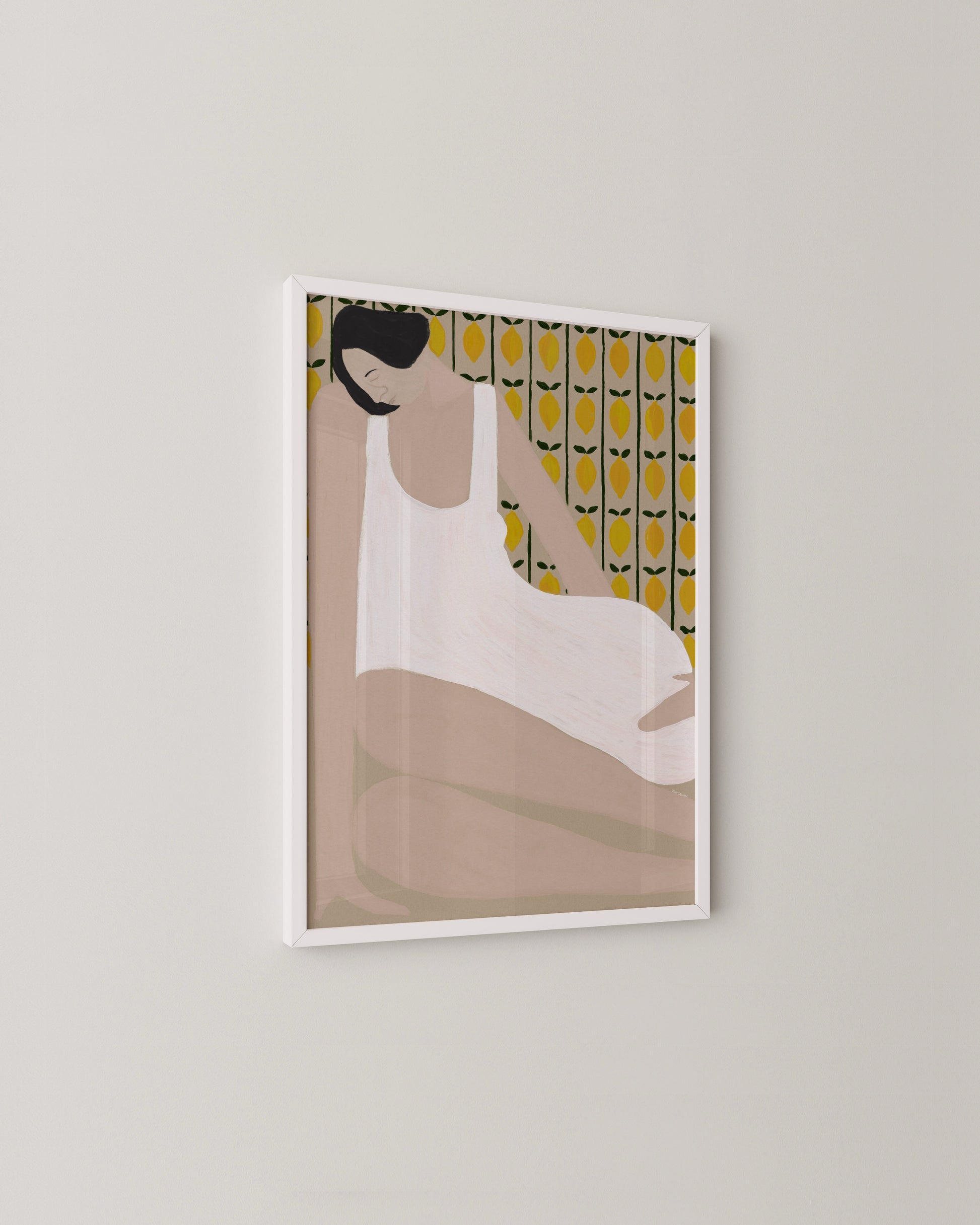 A soft and stylish art print featuring a woman in a white dress against a repeating lemon motif. Combining warm neutrals with a pop of yellow, this piece adds a modern, Mediterranean feel to any space. Perfect for bedrooms, studios, or gallery walls.