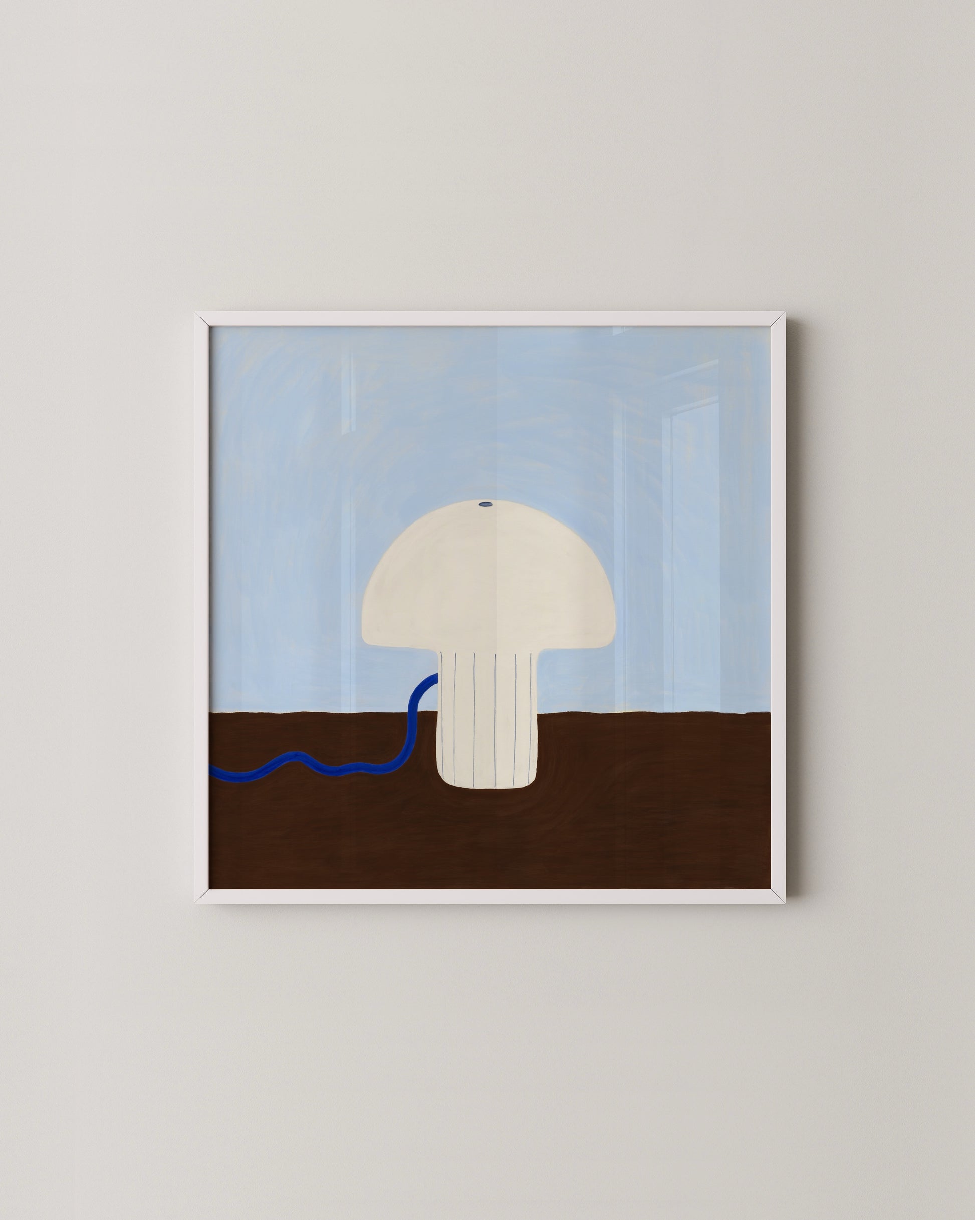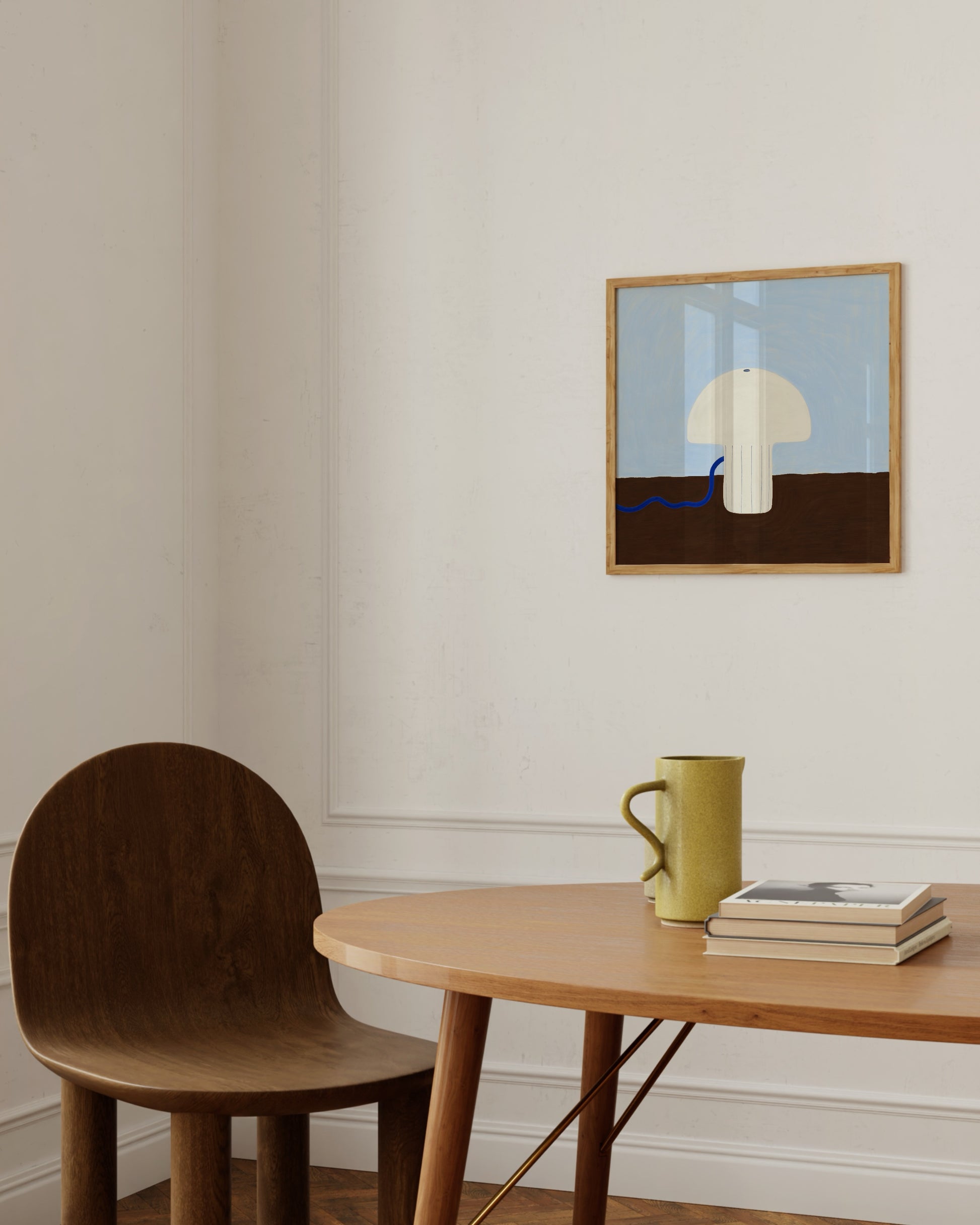 A whimsical mushroom lamp illustration with a soft sky backdrop, earthy base, and playful blue cord. This quirky minimal artwork makes a unique addition to kitchens, living rooms, or gallery walls. Printable wall art, delivered instantly for easy DIY decor.