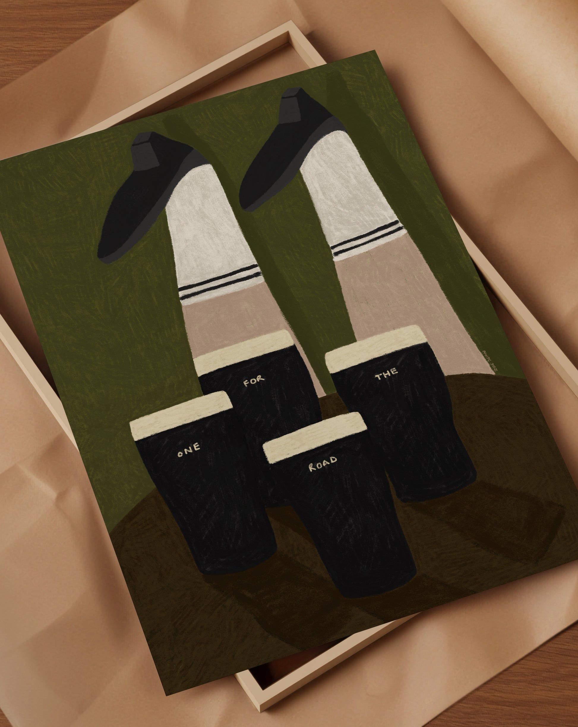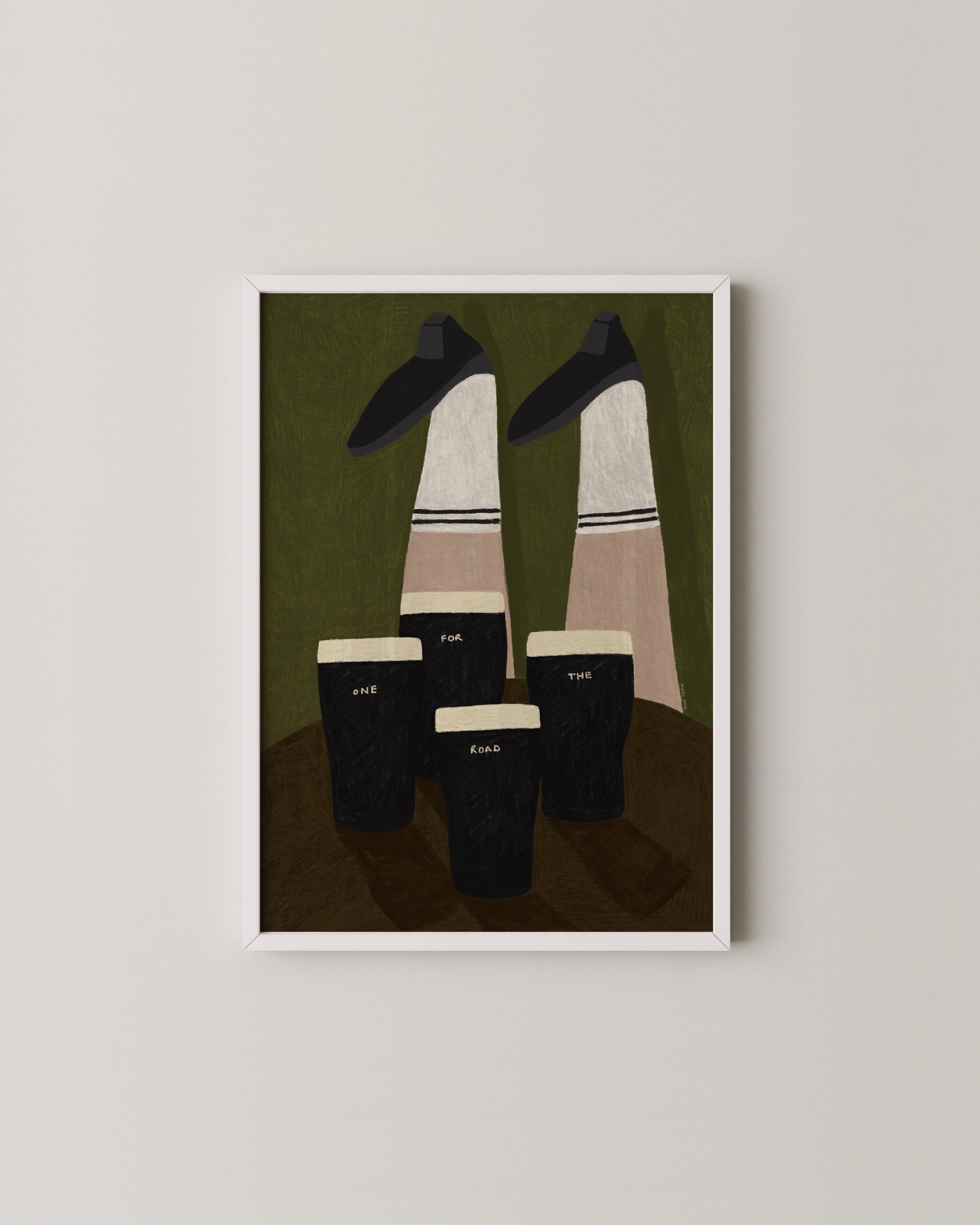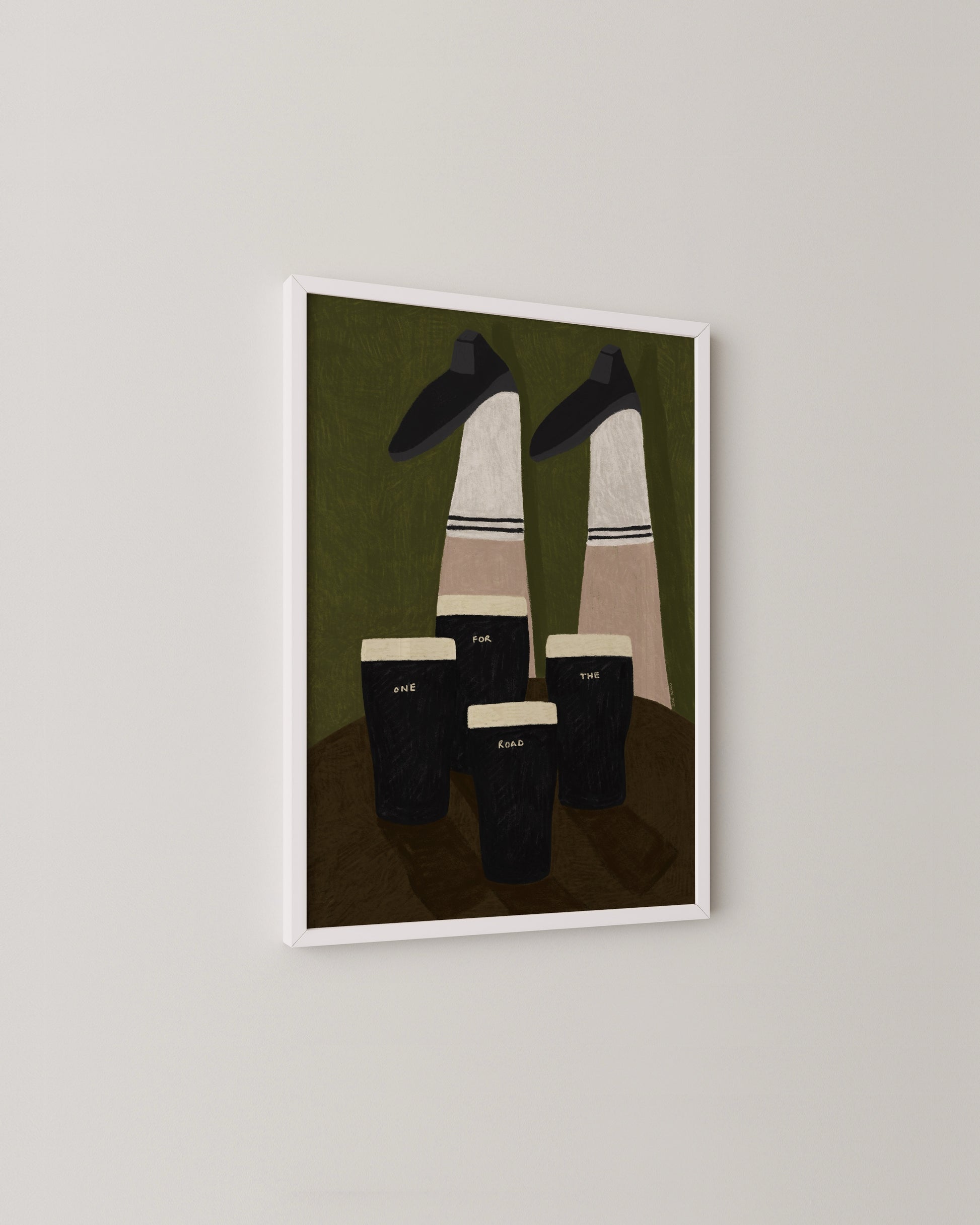 A playful Guinness, themed print with Irish dancing legs and four classic pints, a little wink to “one for the road.” Light-hearted, cosy, and perfect for kitchens, pubs, or anywhere that needs a bit of Irish charm.