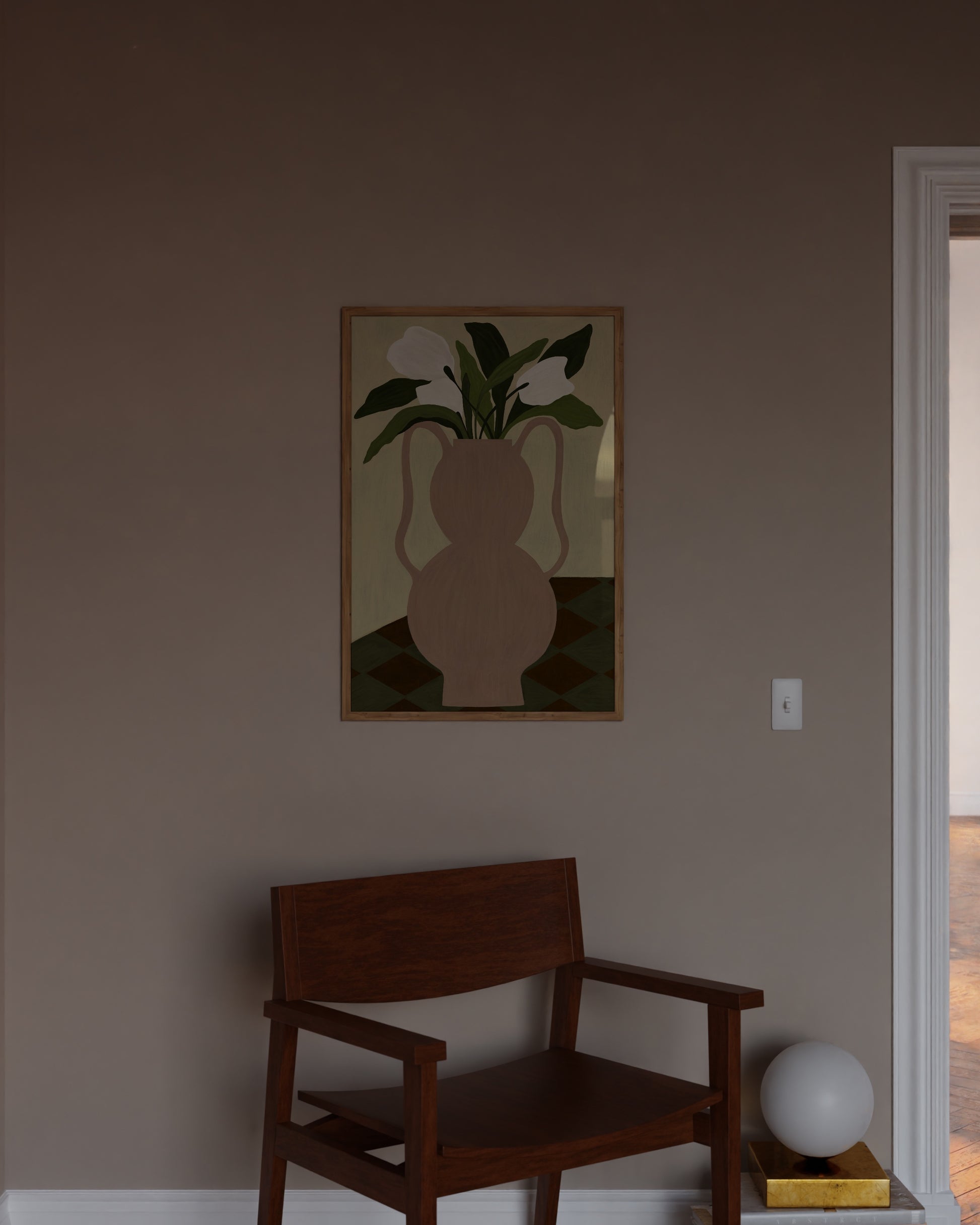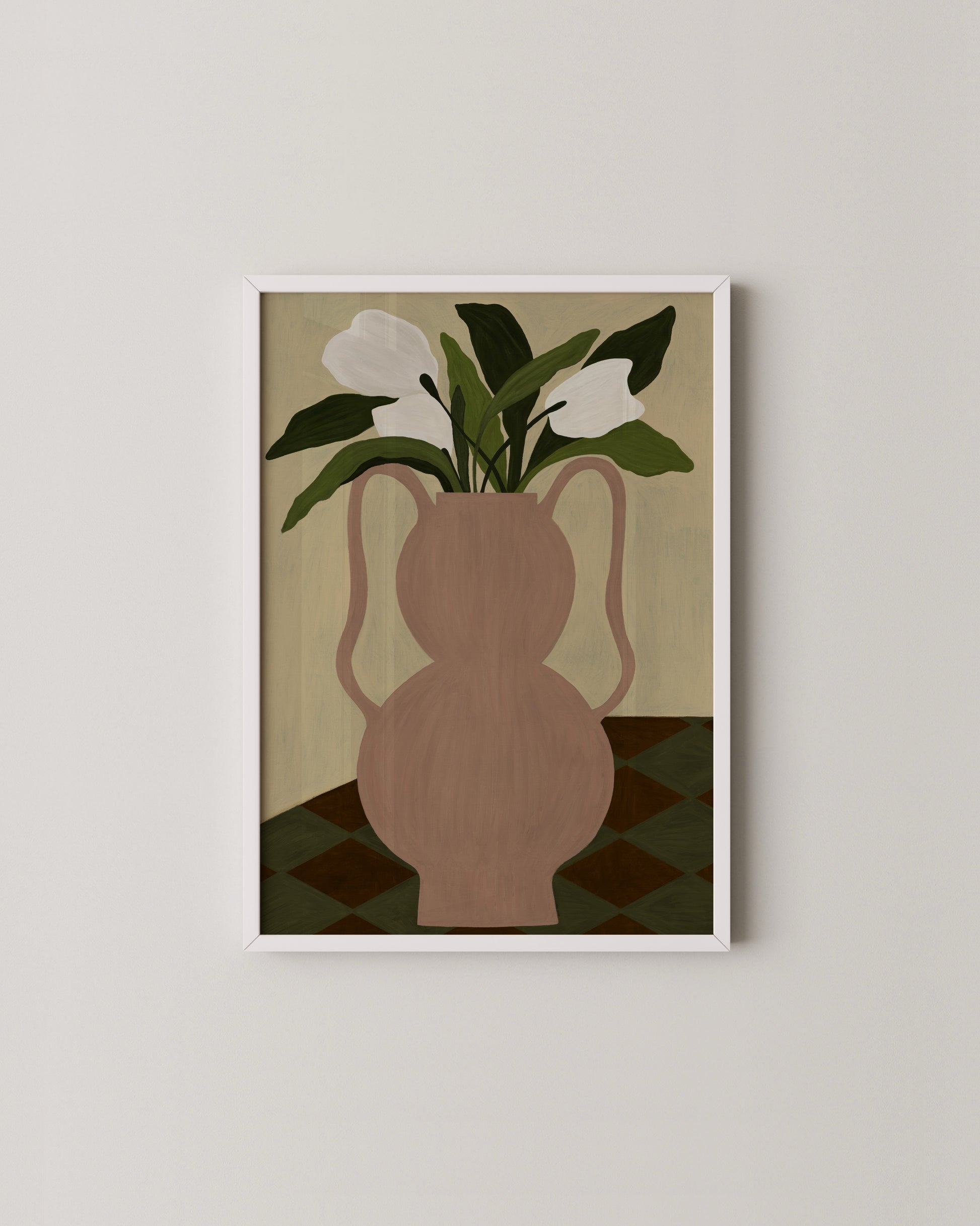 A soft blush pink vase holds white flowers with lush green leaves in this modern still life art print. The muted palette and checkered surface bring a calm, elegant touch, perfect for kitchens, dining rooms, or cozy living spaces.