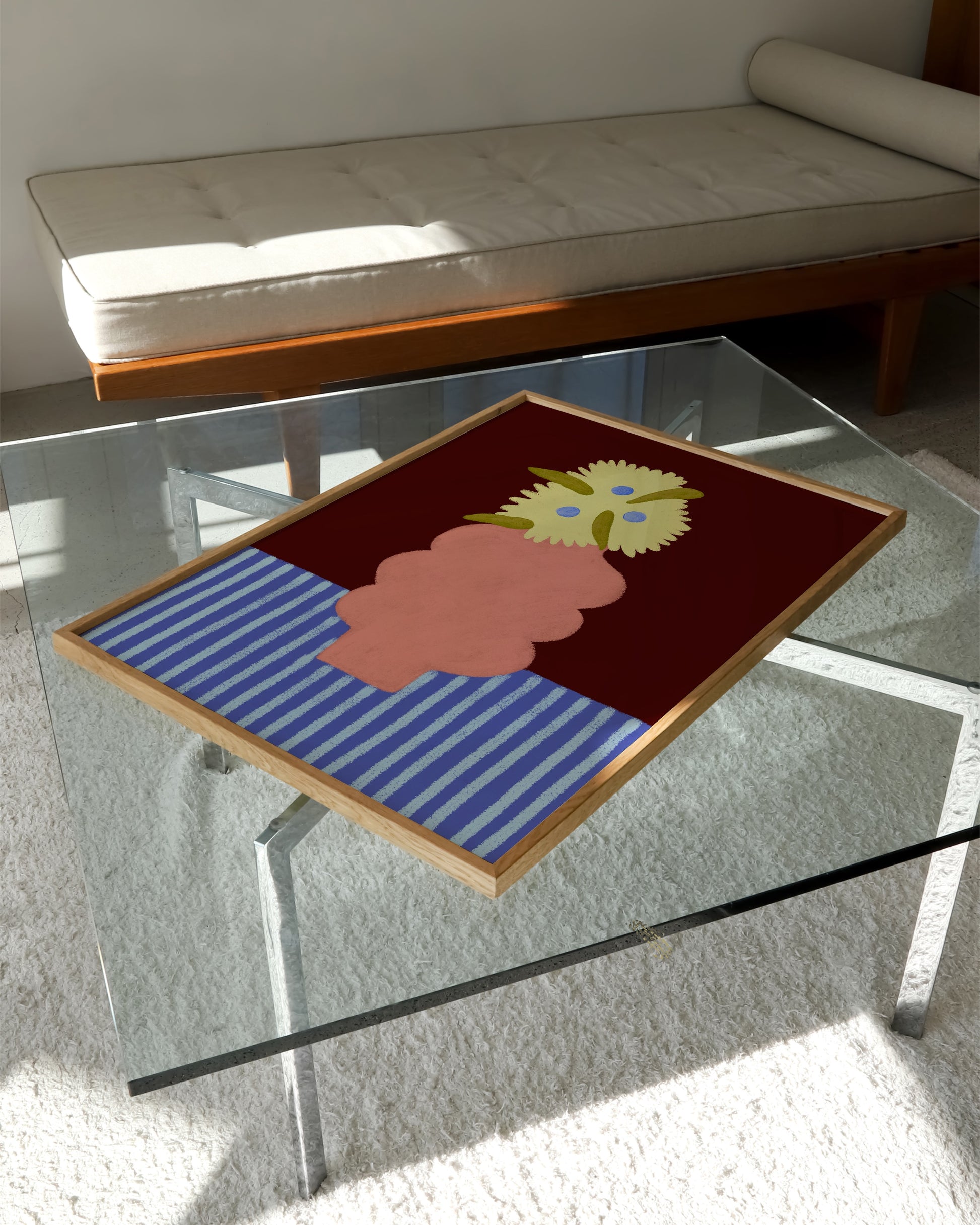 Playful and bold, this abstract vase print features soft yellow flowers and olive leaves against a deep red background with a blue striped base. A contemporary still-life design that adds warmth and character to modern interiors.