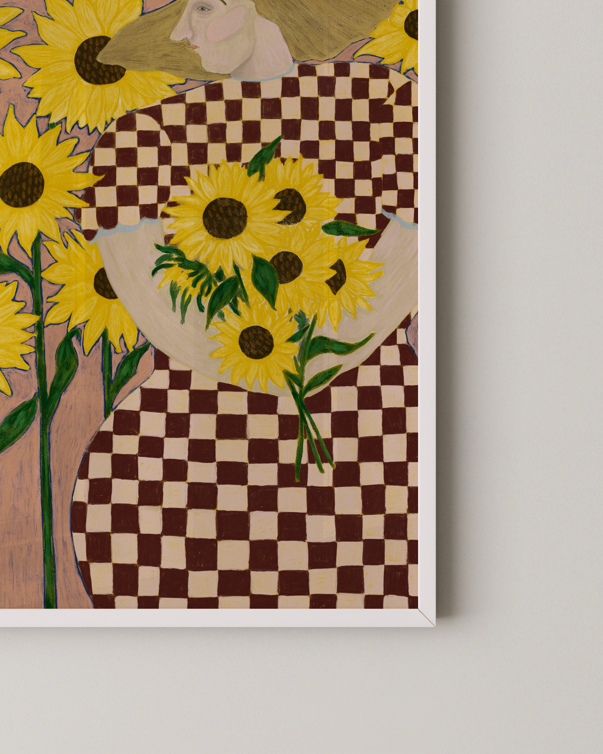 A playful figurative art print featuring a woman surrounded by sunflowers, dressed in a warm checkered pattern. Soft pinks, rich browns, and golden yellow tones give this piece a nostalgic, hand-painted feel. A cheerful yet grounded artwork that adds character to kitchens, dining spaces, or modern gallery walls.