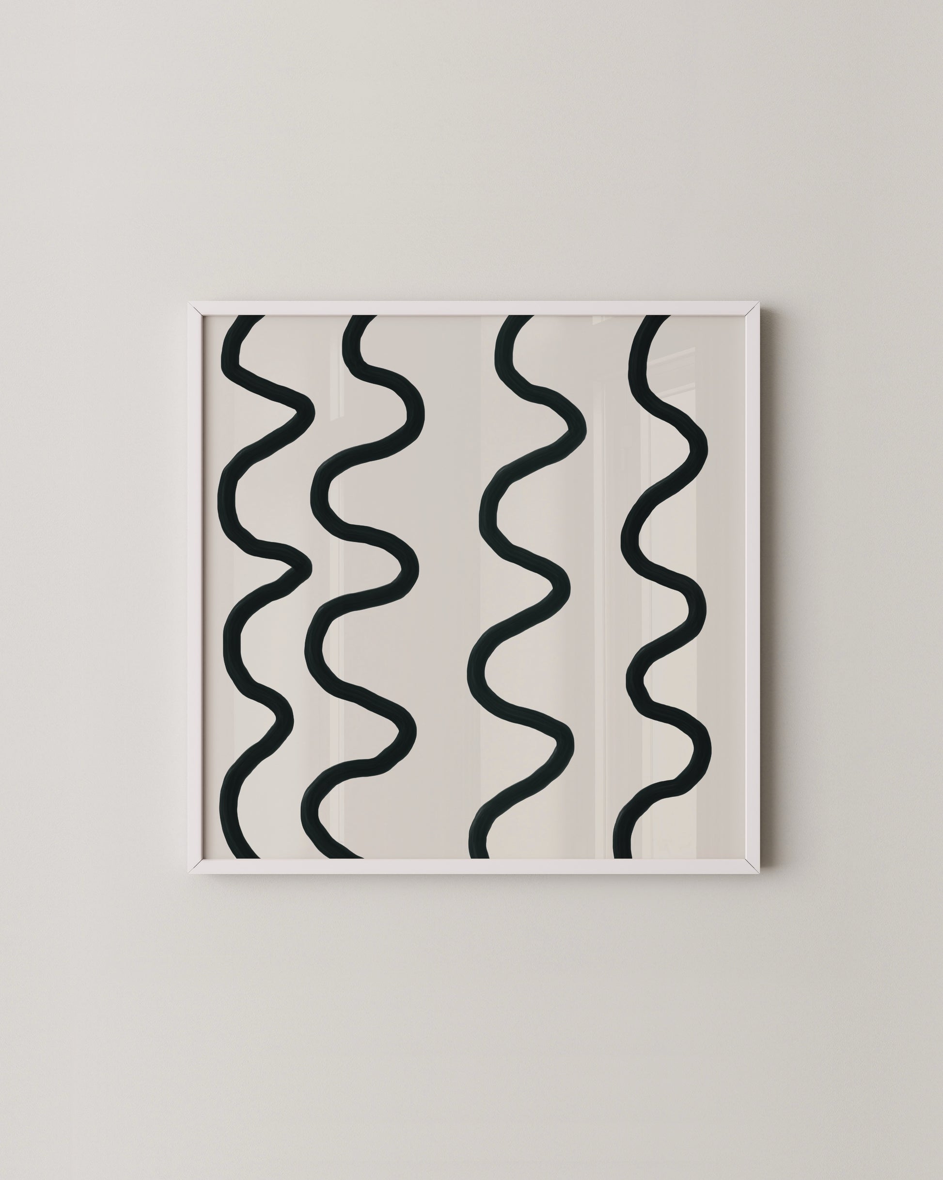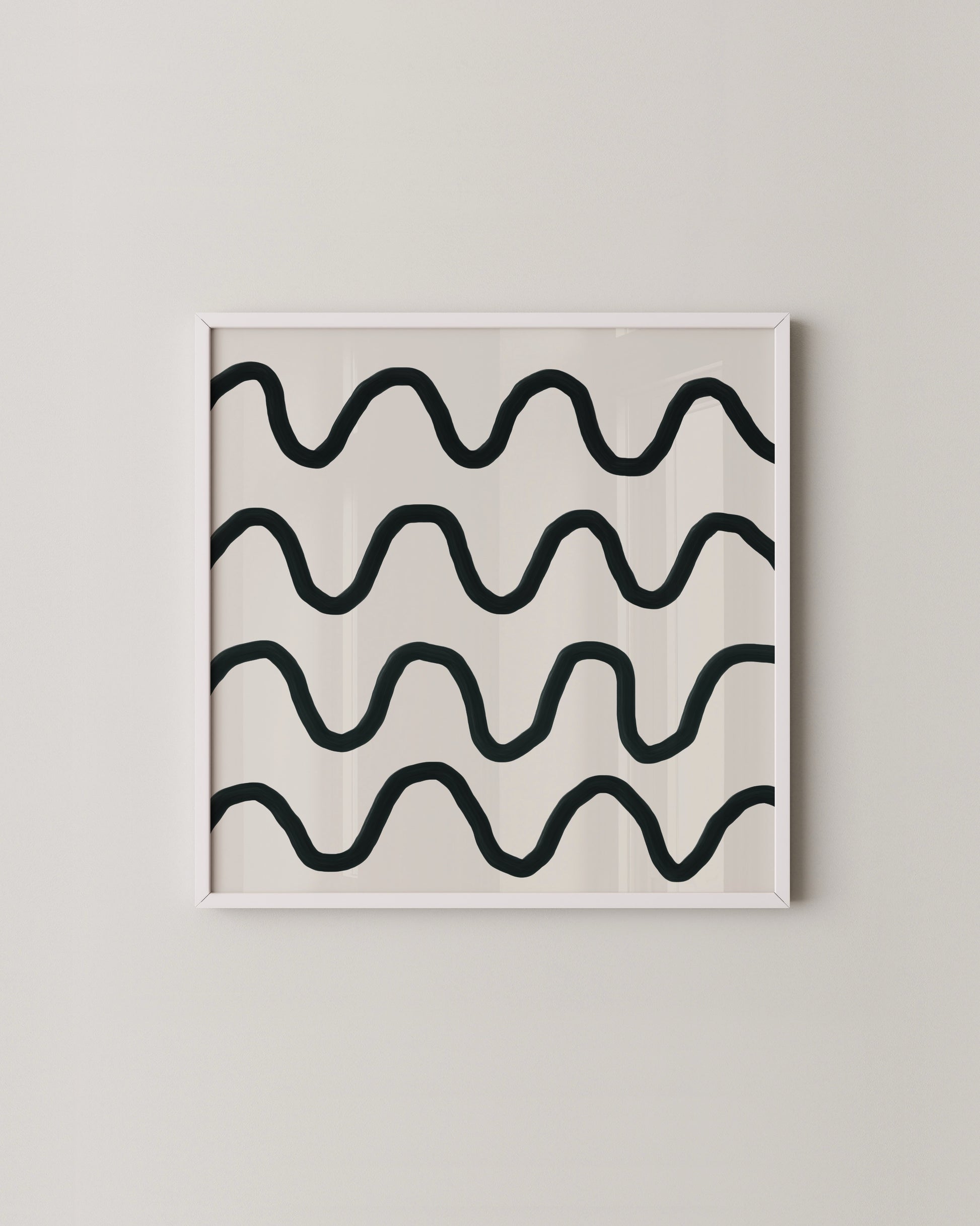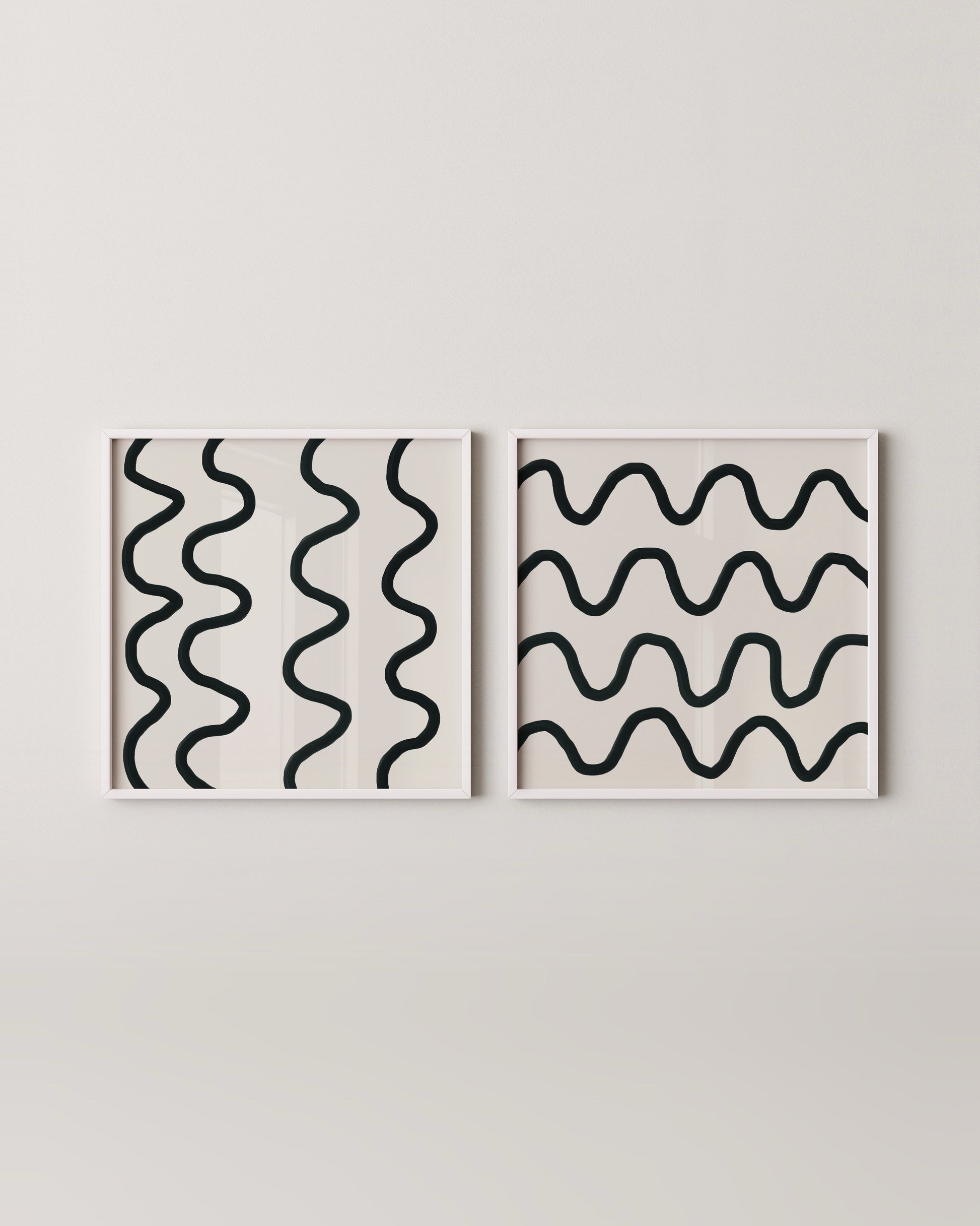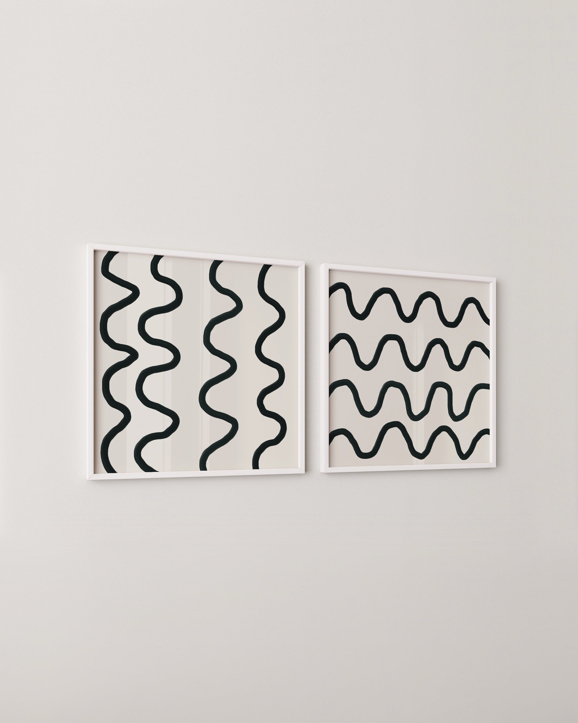 A simple, modern set of two prints featuring bold black wavy lines on soft beige backgrounds. Perfect for adding an understated, graphic touch to any space, from living rooms to creative studios.