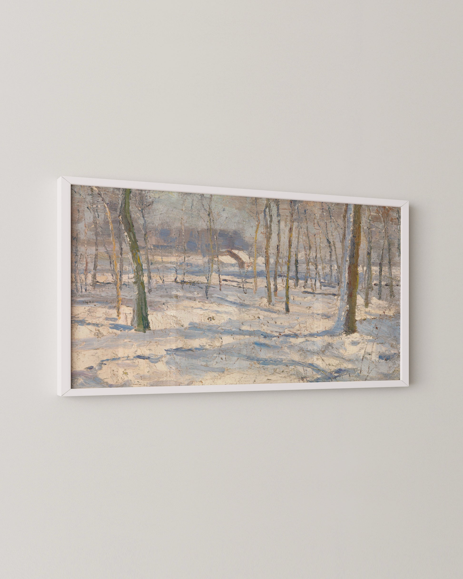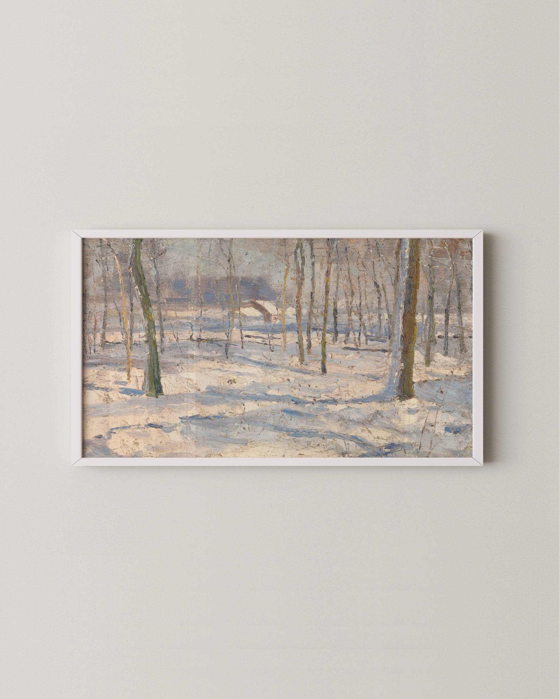 Bring a calm, wintry mood to your space with this vintage-style TV frame art. Featuring a soft, snowy woodland scene in muted tones, this digital download is designed to fit Samsung Frame TVs and other screens. A peaceful piece that blends seamlessly with minimalist, Nordic, or rustic interiors.